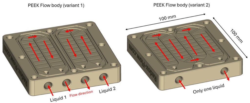 The solution developed by Redox-Flow.com comes in three different configurations that are based on the same components and can be interchanged depending on the purchased option (upgrading is always possible). All options include a PEEK flow body and metal block, shown in the pictures below. The PEEK body contains one (variant 1) or two separate (variant 2) flow chambers for heating/cooling one or two independent liquids, respectively. The liquids in the experimental setup are circulated through the PEEK flow body and placed against a metal heating/cooling plate, whereby heat is transferred to or from the liquids in the PEEK flow body. The metal plate is separated from the liquids in the experimental setup by a thin PTFE sheet, whereby corrosive/oxidative solutions can also be heated without corroding the metal plate. At the time of the studies, the material of the heating block was aluminium.
