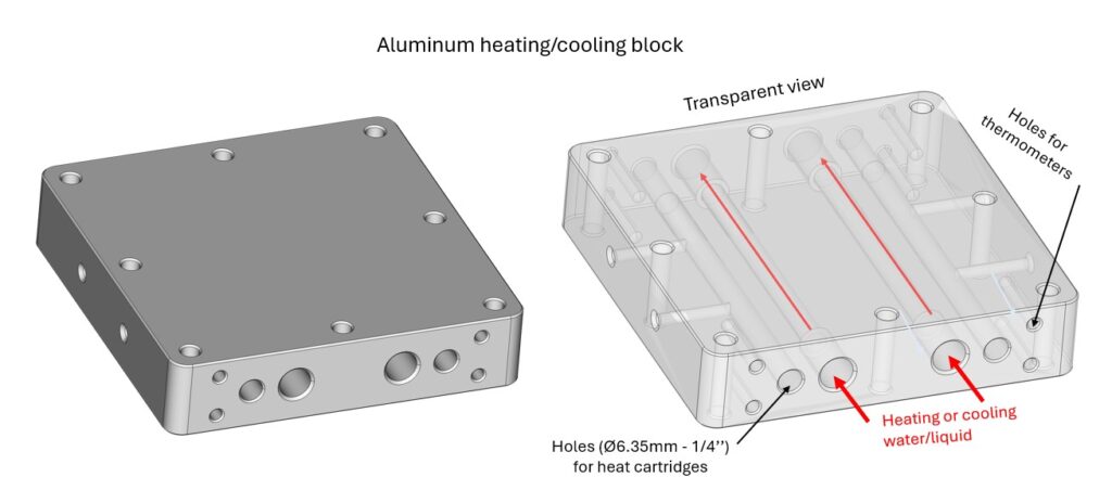 The aluminium block can be 1) heated by placing it on a heating plate, or 2) heated or cooled using heat cartridges for liquids and thermometers.