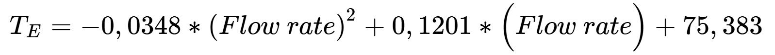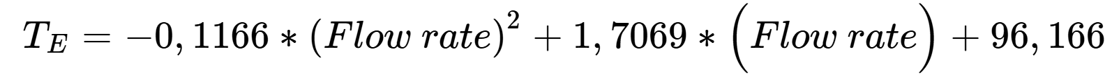 The exiting liquid temperature (TE) can be estimated using the empirical formulas below. These equations relate (TE) to the flow rate at different heater setpoints (80 °C, 100 °C, and 120 °C). These models are valid for flow rates between 4 and 20 mL/min. Extrapolation beyond this range may result in unreliable predictions.