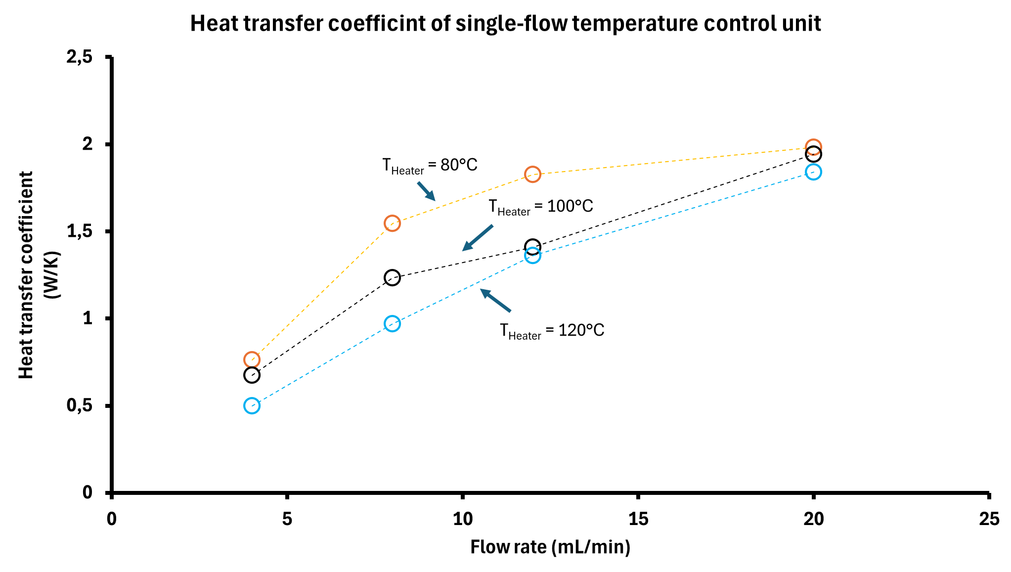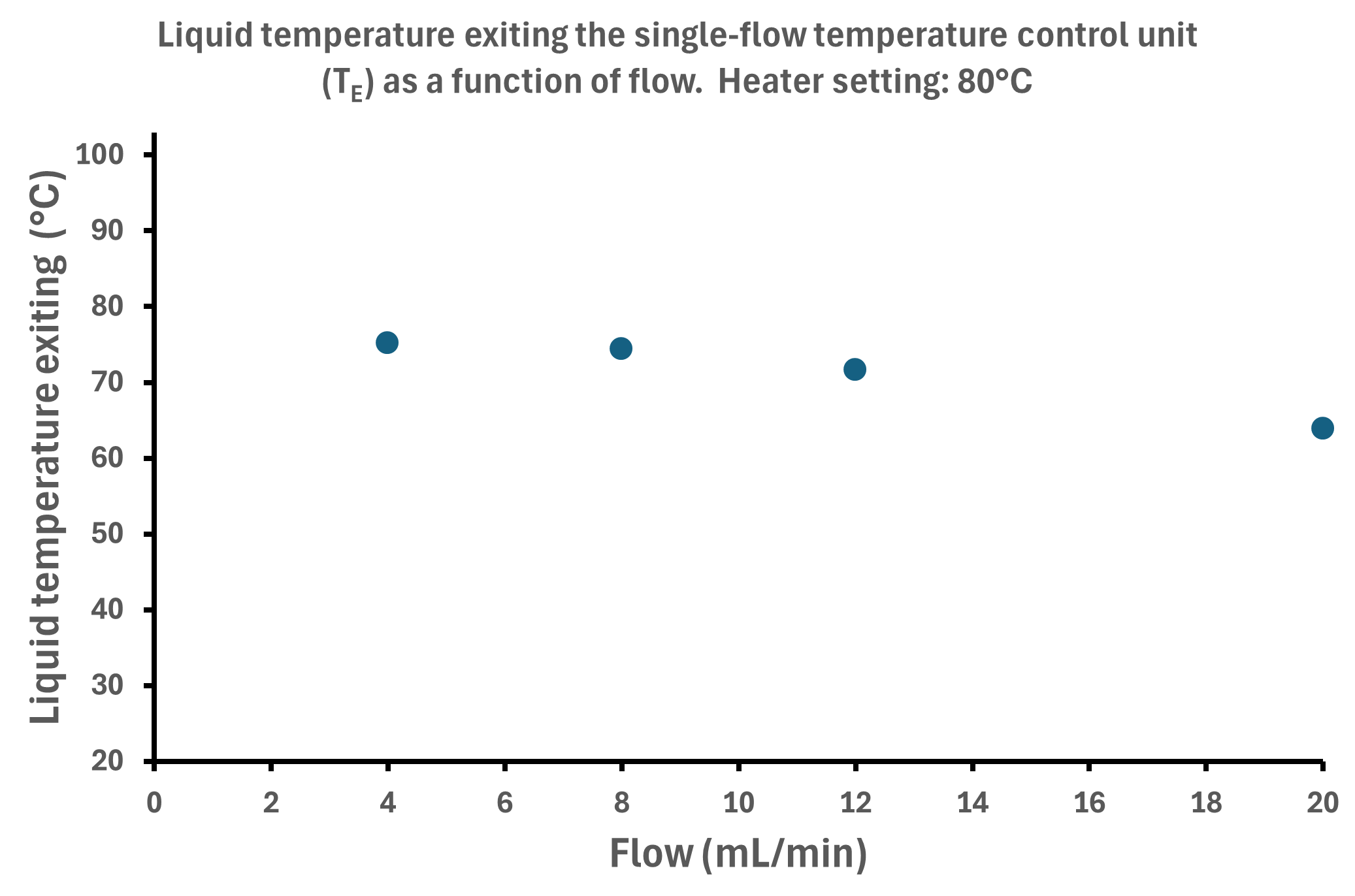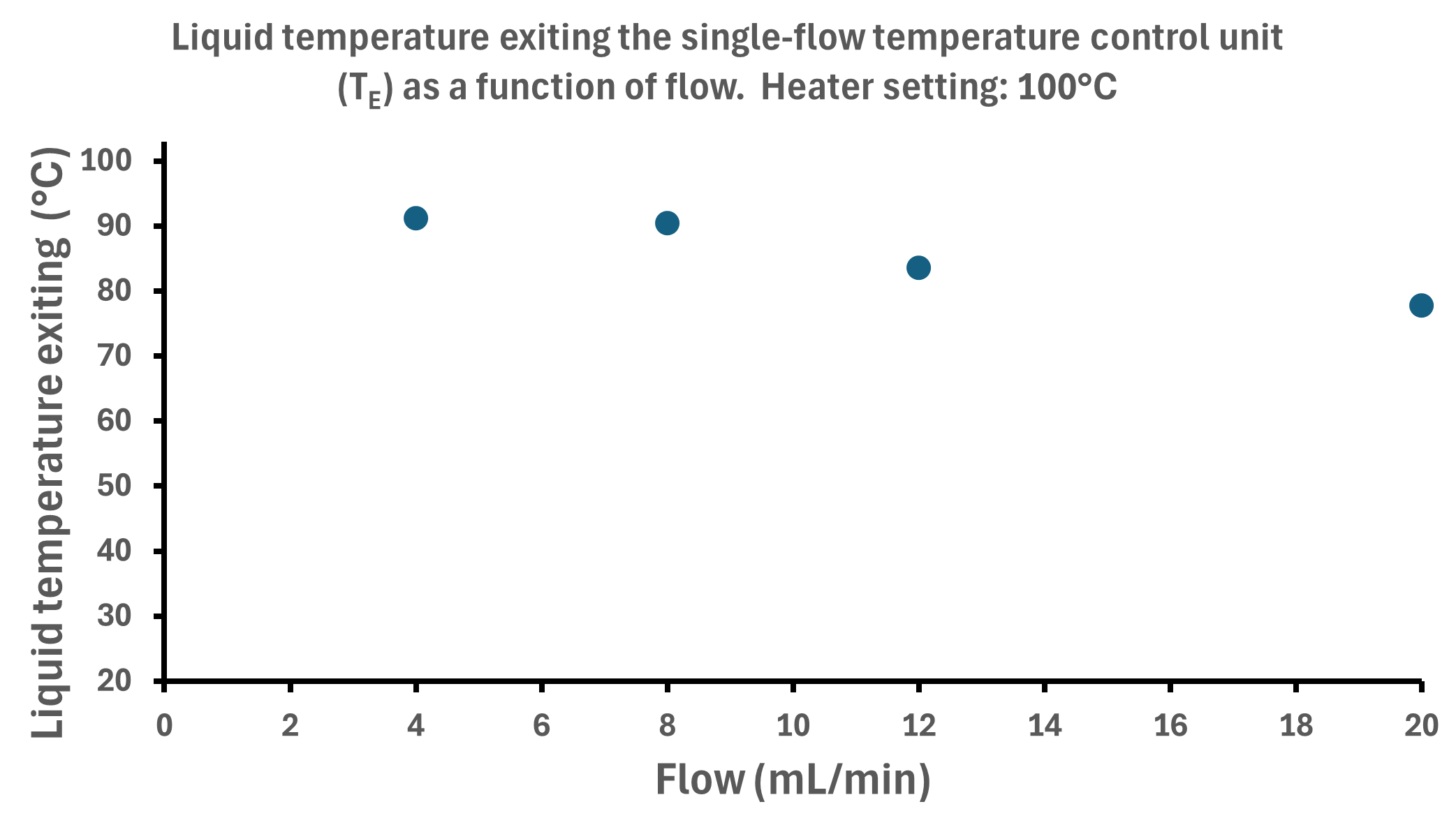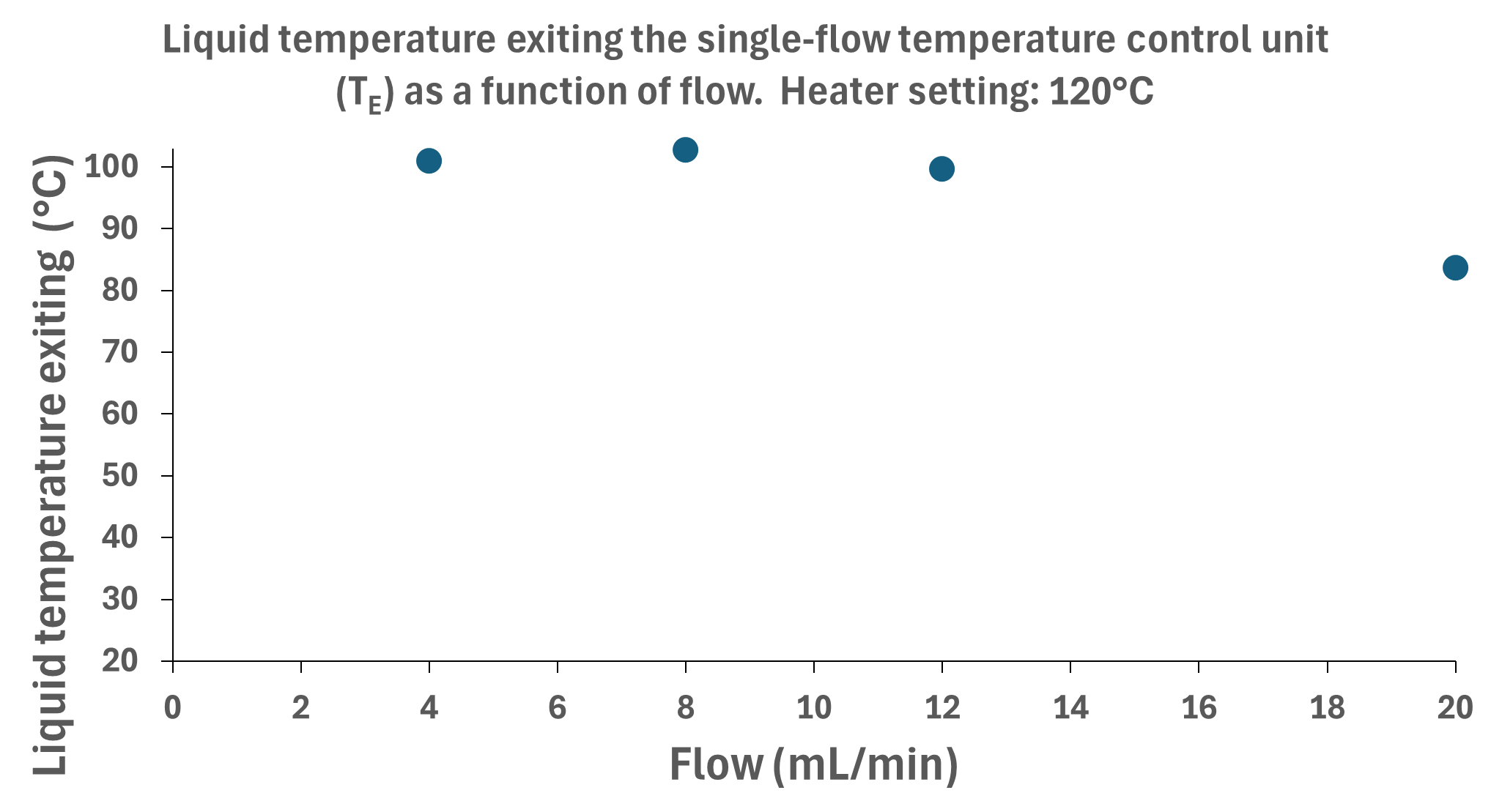 Thus, at a heater setting of 100 °C, a flow rate of approximately 17,35 mL/min results in an exiting liquid temperature of 80 °C.