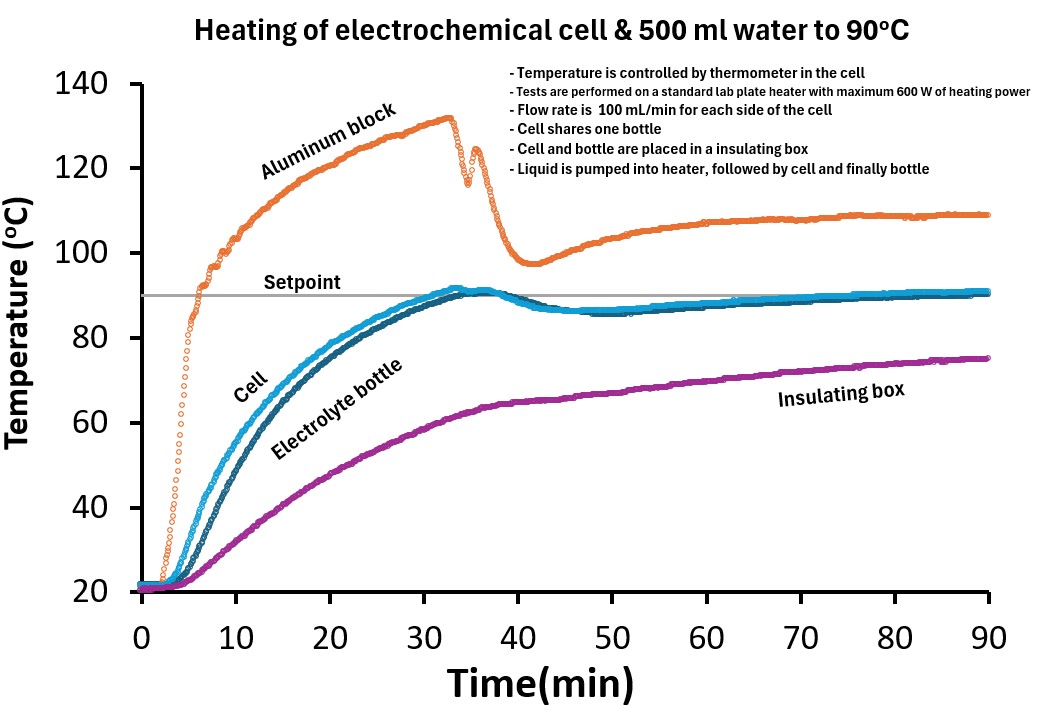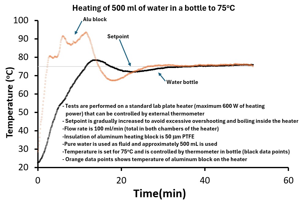 Graph below shows a configuration where the unit is placed on a heating plate and connected to a pump and a bottle with 500 mL of water (i.e., an electrochemical cell is not included in the circuit). The heating plate has a maximum of 600 W heating power and PID control, where the input for the control is an external thermometer, which in this case is placed in a bottle. In addition to this thermometer, one is also placed inside the aluminum block. In this test, the water temperature set-point in the bottle was set at 75°C. It is seen that the water reaches 75°C within 15 minutes and stability is reached within about 35 minutes. Better control strategies can shorten time before stability.